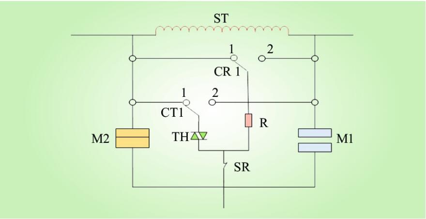 文獻[12]介紹了一種組合式分接開關,主要由TADS型切換開關和選擇器組成,切換開關的觸頭系統由晶閘管和機械觸頭組成,晶閘管作為切換開關的開關元件承擔電弧觸頭功能,負責開斷切換過程中的電流。TADS型切換開關原理如圖6所示,其中ST為變壓器高壓繞組線圈,CR1為過渡電阻回路選擇器,R為過渡電阻,CT1為晶閘管回路選擇器,TH為晶閘管,SR為固態繼電器,M1與M2為機械觸點。